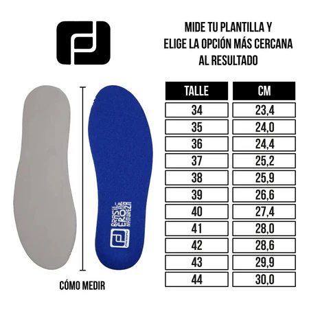Talla 34 - 23,4 cm / Talla 35 - 24,0 cm / Talla 36 - 24,4 cm / Talla 37 - 25,2 cm / Talla 38 - 25,9 cm / Talla 39 - 26,6 cm / Talla 40 - 27,4 cm / Talla 41 - 28,0 cm / Talla 42 - 28,6 cm / Talla 43 - 29,0 cm / Talla 44 - 30,0 cm.