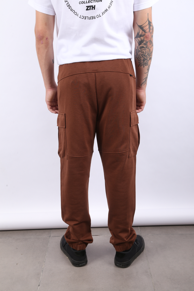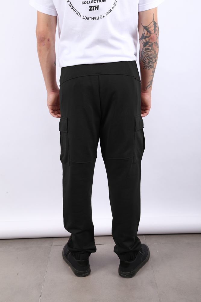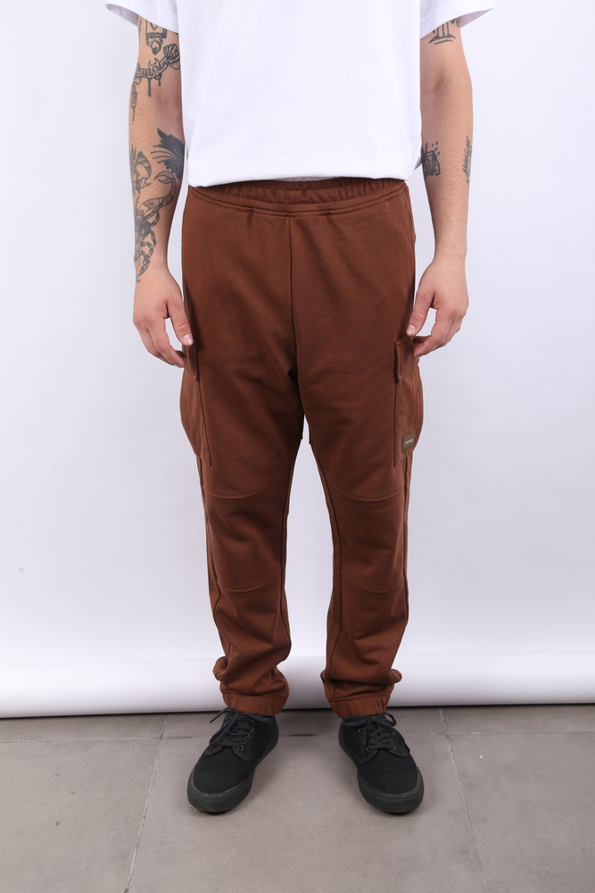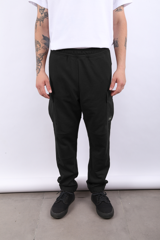 Jogging tipo cargo en rústico de algodón. Elástico en cintura, regulable con cordones personalizados. Elástico en puños. Bolsillos delanteros. Bolsillos laterales con tapa. Canesú trasero y recortes en piernas. Etiqueta diferenciada en efecto cuero con logo de marca. Etiquetas de marca. 60% ALGODÓN / 40% POLIESTER.