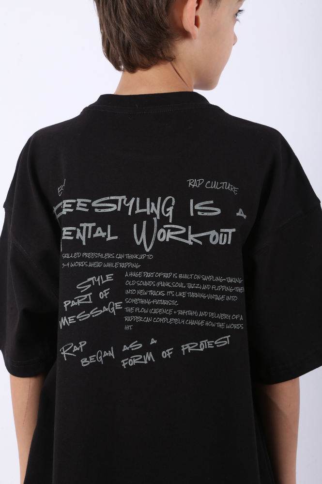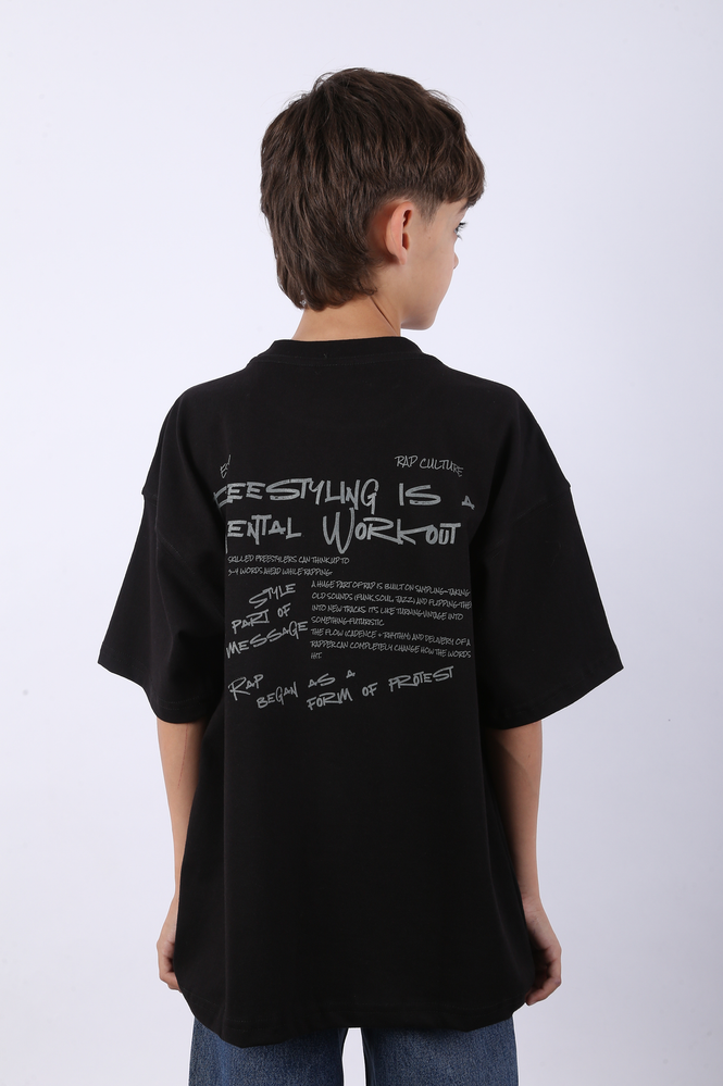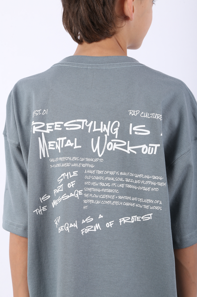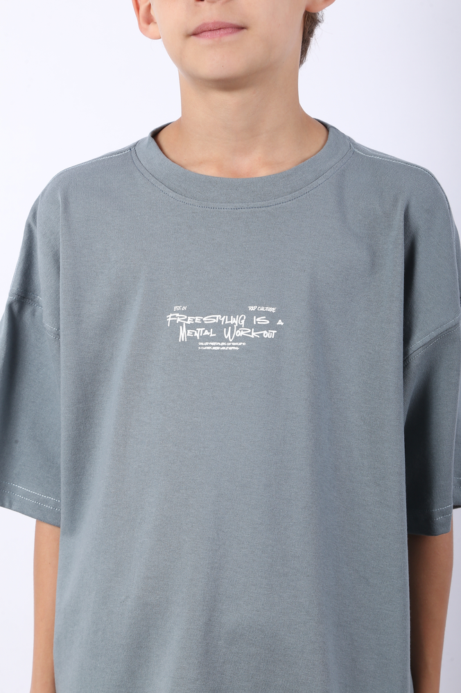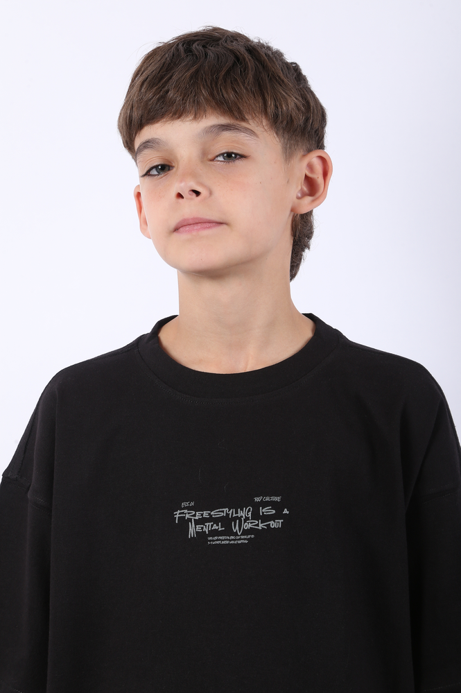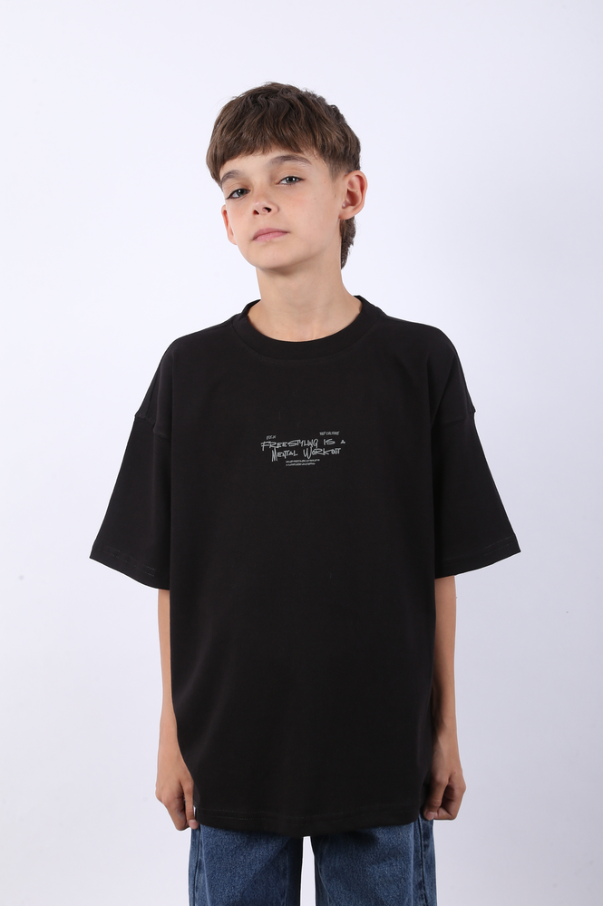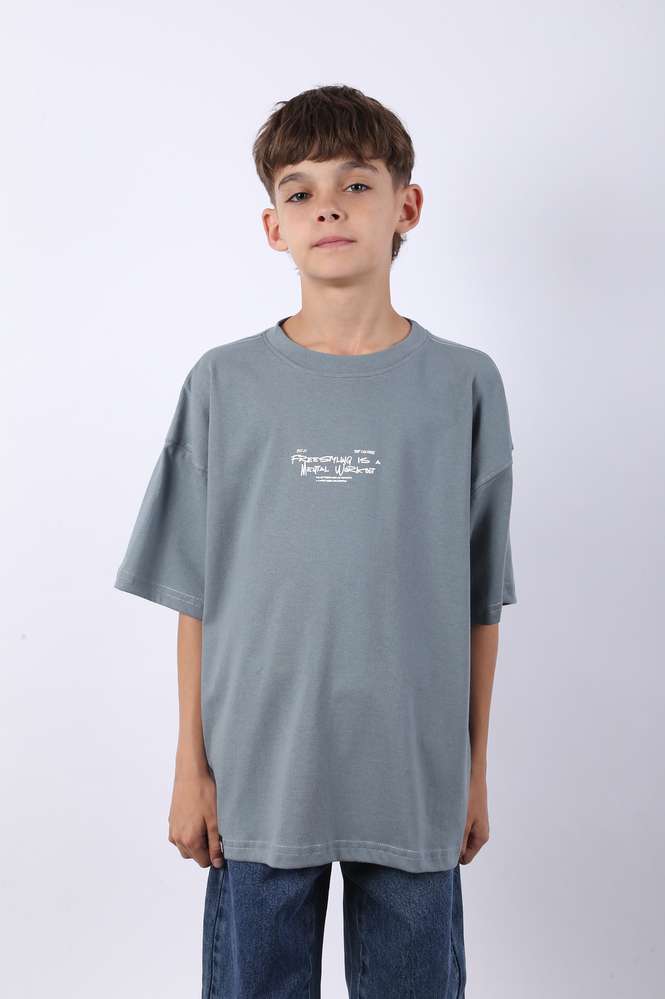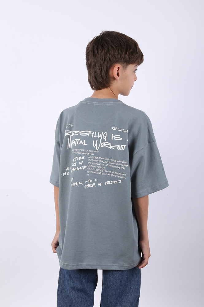 Remera mangas cortas oversize de niño. Estampa serigráfica plana y a un color, en frente y espalda. JERSEY 16/1 - 100% ALGODÓN.