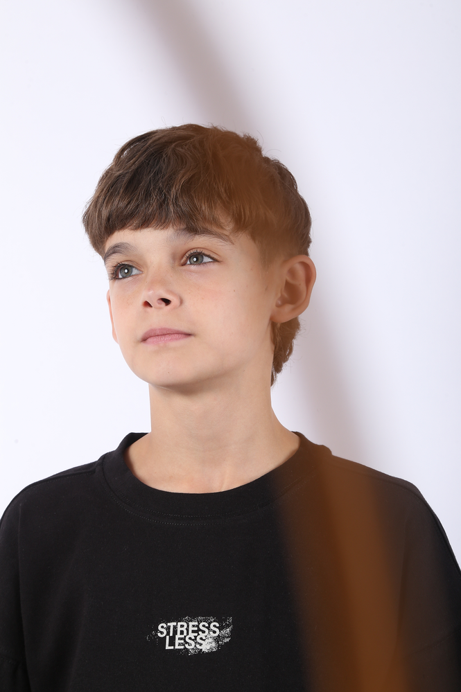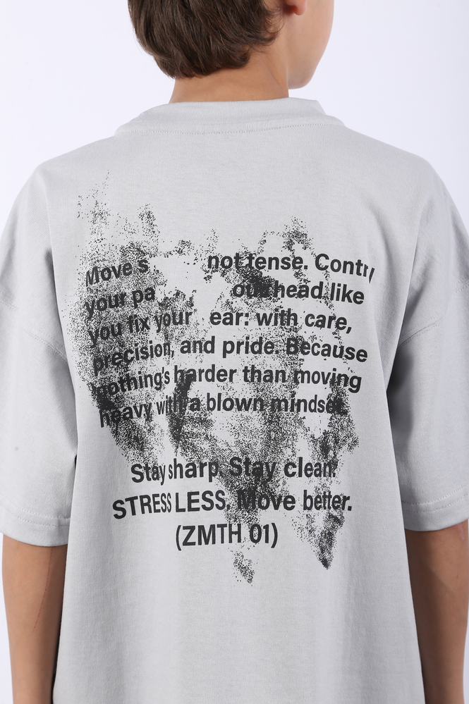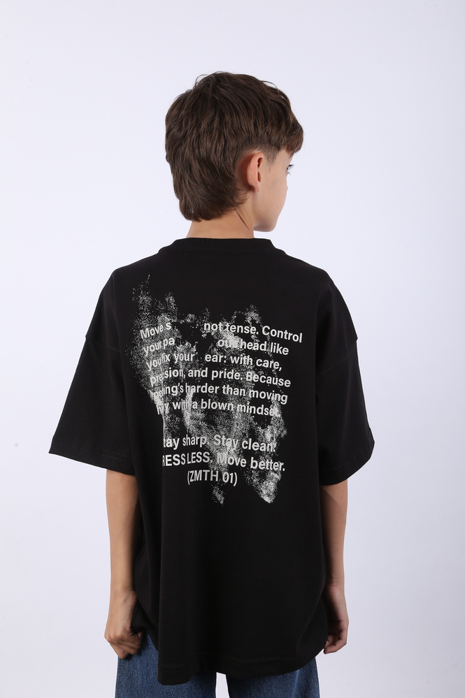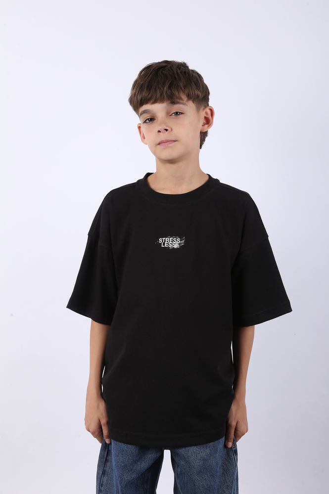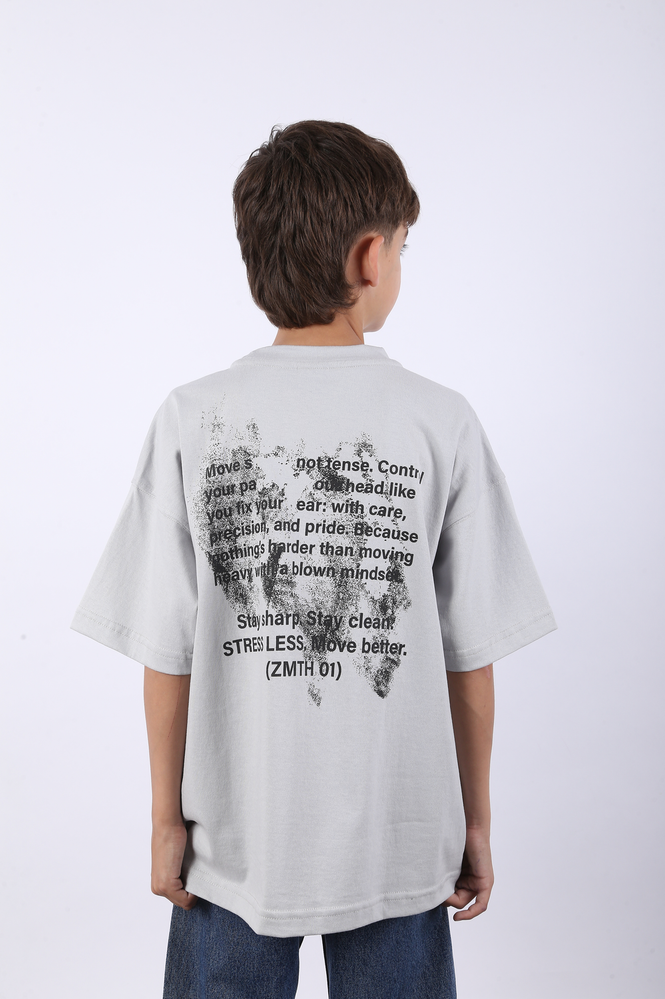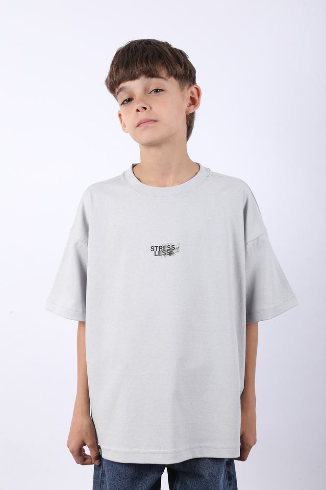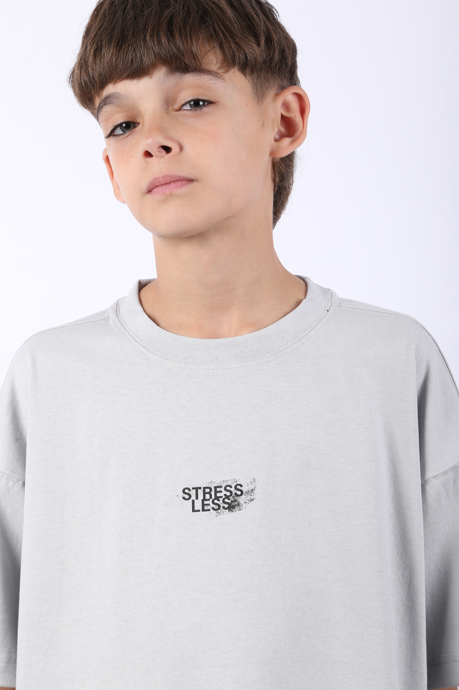 Remera mangas cortas oversize de niño. Estampa serigráfica plana y a un color, en frente y espalda. JERSEY 16/1 - 100% ALGODÓN.