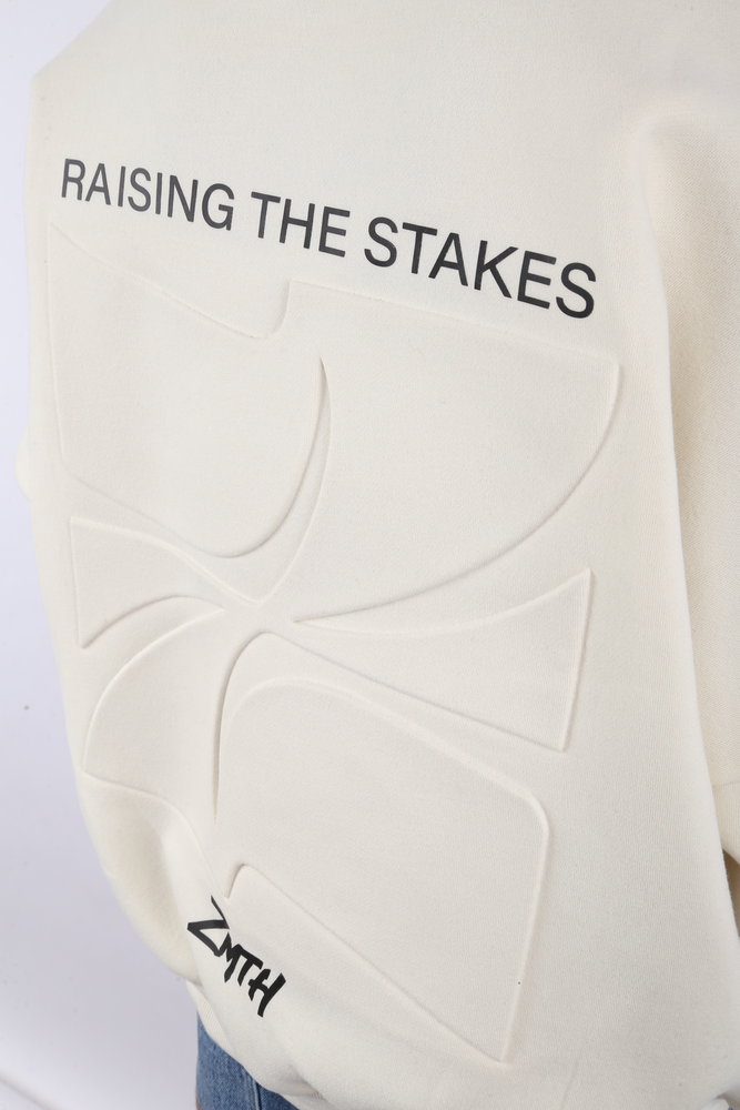 Buzo cuello base. Con motivo gofrado y estampado, en frente y espalda. Etiquetas de marca. FRISA. 60% ALGODÓN - 40% POLIÉSTER.