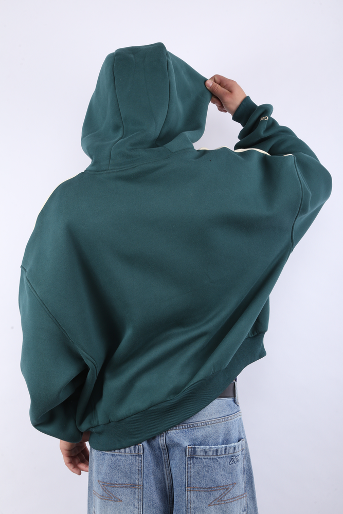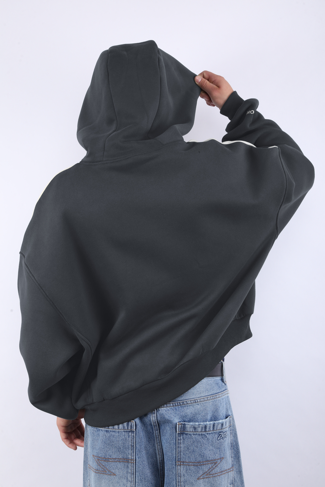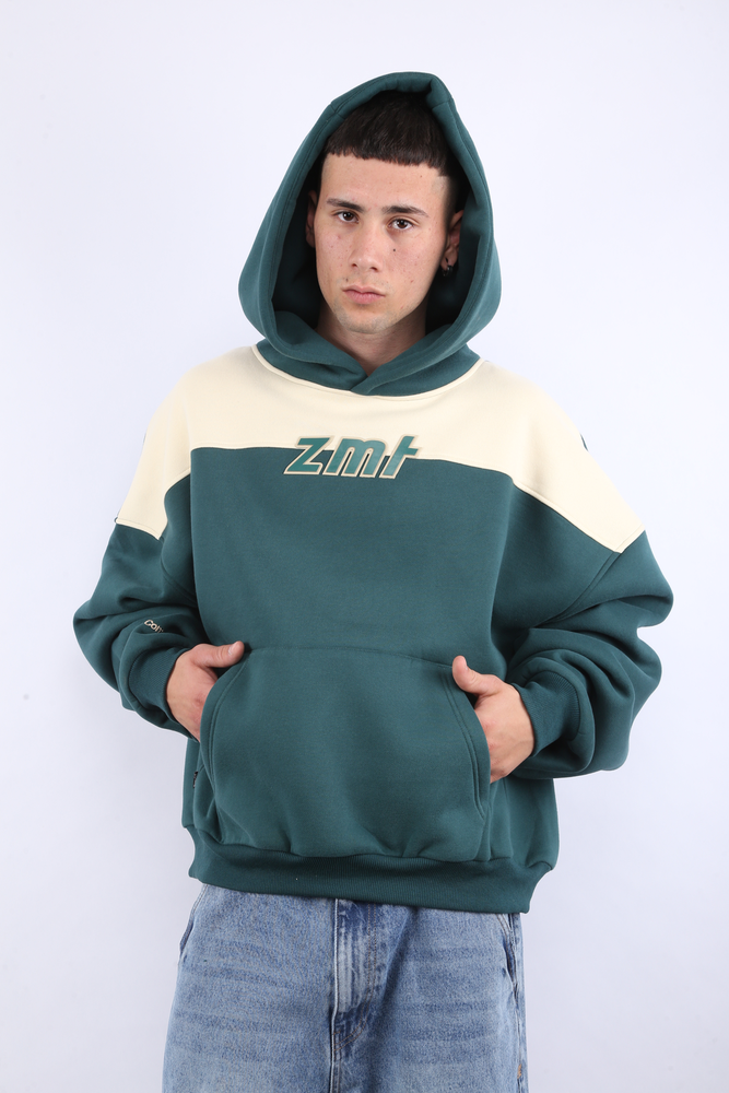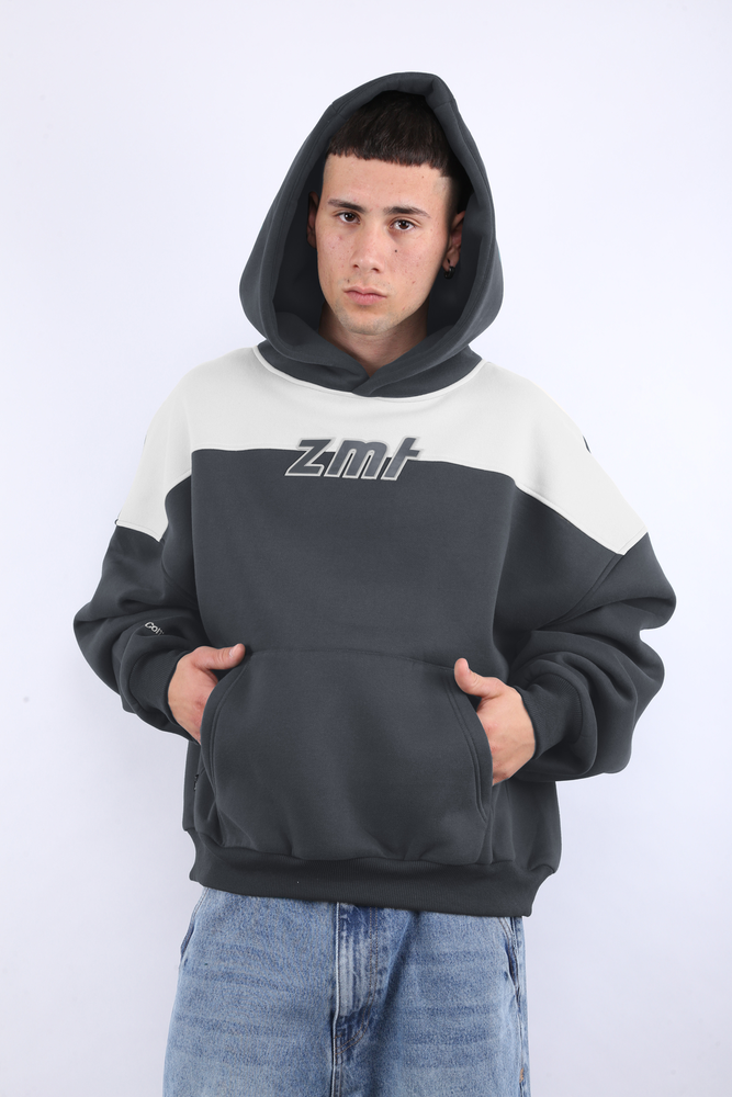 Buzo hoodie boxy con recortes varios. Detalle bordado en manga. Logo en parche de silicona en frente. Etiqueta tipo gomita con logo en espalda baja. Avíos personalizados. Etiquetas de marca. FRISA. 60% ALGODÓN - 40% POLIÉSTER.
