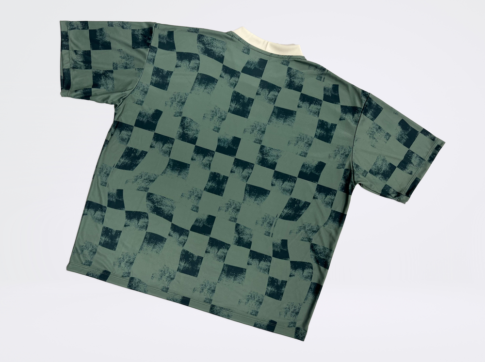 Remera mangas cortas boxy, con cuello en V.Tela diferenciada tipo dryfit, sublimada en full print. Estampa en vinilo en frente. Etiquetas de marca.